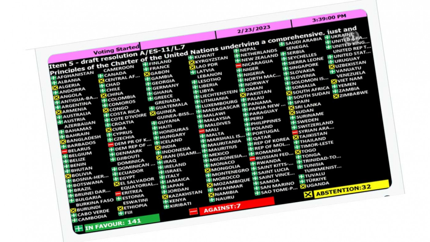 ভিয়েনায় ইউরোপীয় নিরাপত্তা সংস্থার পার্লামেন্টারি অধিবেশনে রাশিয়ার ভাষণ চলাকালীন বিপুল সংখ্যক প্রতিনিধি ওয়াক আউট করার পর ভোট গ্রহণ করা হয়। অর্গানাইজেশন ফর সিকিউরিটি অ্যান্ড কো-অপারেশন ইন ইউরোপ (ওএসসিই) এর ওয়াকআউট এবং ইউক্রেনে রাশিয়ার আগ্রাসনের বর্ষ পূর্তির আগের দিন জাতিসংঘের এ ভোট হয়। জাতিসংঘের ভোটে যত তাড়াতাড়ি সম্ভব শান্তির জন্য আহ্বান জানানো হয়েছে।