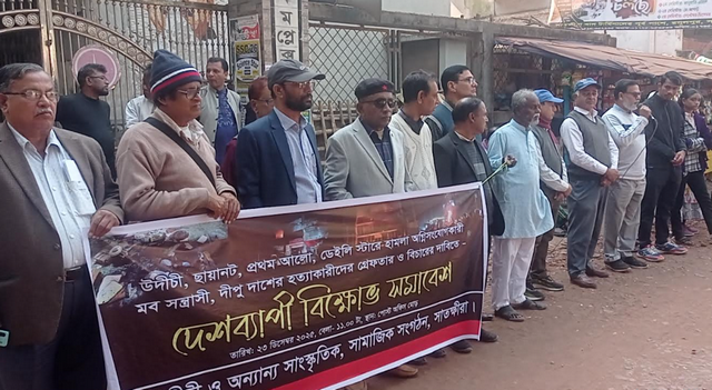 উদীচি, ছায়ানট, প্রথম আলো, ডেইলি স্টারে হামলা অগ্নিসংযোগকারী মব সন্ত্রাসী দীপু দাশের হত্যাকারীদের গ্রেফতার ও বিচারের দাবিতে দেশব্যাপী বিক্ষোভ সমাবেশ অনুষ্ঠিত হয়েছে। মঙ্গলবার ২৩ শে ডিসেম্বর বেলা ১১ টায় সাতক্ষীরা পোস্ট অফিস মোড়ে উদীচি ও অন্যান্য সাংস্কৃতিক, সামাজিক সংগঠন সাতক্ষীরার আয়োজন মানববন্ধন অনুষ্ঠিত হয়। এ মানববন্ধনে সংগঠনের উপদেষ্টা অধ্যক্ষ আব্দুল হামিদের সভাপতিত্বে বক্তব্য রাখেন, জেলা বিএনপির সাবেক আবহাওয়া এড. সৈয়দ ইফতেখার আলী, বীর মুক্তিযোদ্ধা অধ্যক্ষ সুভাষ সরকার, পৌর বিএনপির সাবেক সভাপতি হাবিবুর রহমান হবি, জেলা নাগরিক কমিটির আহ্বায়ক এড. শেখ আজাদ হোসেন বেলাল, প্রথম আলোর নিজস্ব প্রতিবেদক কল্যাণ ব্যানার্জি, উদীচি সাতক্ষীরা জেলা শাখার সভাপতি শেখ সিদ্দিকুর রহমান, সহসভাপতি আবুল হোসেন, বাংলাদেশ জাসদ সাংগঠনিক সম্পাদক প্রভাষক ইদ্রিস আলী, বাসর জেলা সমন্বয়ক নিত্যানন্দ সরকার, গণআন্দোলন জোট আহবায়ক খগেন্দ্রনাথ ঘোষ, স্বদেশের নির্বাহী পরিচালক মাধব চন্দ্র দত্ত, জেলা মন্দির সমিতির সভাপতি এড. সোমনাথ ব্যানার্জি, জেএসডি সাতক্ষীরা জেলা শাখার যুগ্মসম্পাদক আব্দুল জব্বার মাস্টার, নদী বোন ও পরিবেশ রক্ষা কমিটি সাধারণ সম্পাদক শেখ মফিজুর রহমান, বিপ্লবী ওয়ার্কার্স পার্টি সাতক্ষীরা সাধারণ সম্পাদক মনসুর রহমান প্রমুখ।