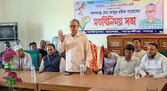 আসন্ন ত্রয়োদশ জাতীয় সংসদ নির্বাচনকে সামনে রেখে সাতক্ষীরা-২(সাতক্ষীরা সদর-দেবহাটা) আসনে জাতীয়তাবাদী দল বিএনপি মনোনীত ধানের শীষের প্রার্থী গণমানুষের প্রাণপ্রিয় জননন্দিত নেতা আলহাজ্ব মো. আব্দুর রউফের সাথে ঝাউডাঙ্গা কলেজের শিক্ষকদের মতবিনিময় সভা অনুষ্ঠিত হয়েছে। রবিবার (২৩ নভেম্বর) দুপুরে সাতক্ষীরা সদরের ঝাউডাঙ্গা কলেজের আয়োজনে কলেজের শিক্ষক মিলনায়তনে কলেজের অধ্যক্ষ মো. খলিলুর রহমানের সভাপতিত্বে মতবিনিময় সভায় প্রধান অতিথি হিসেবে বক্তব্য রাখেন সাতক্ষীরা-২ আসনের ধানের শীষের প্রার্থী জননন্দিত নেতা আলহাজ্ব মো. আব্দুর রউফ। প্রধান অতিথির বক্তব্যে তিনি বলেন, জাতীয়তাবাদী দল বিএনপির ভারপ্রাপ্ত চেয়ারম্যানসহ কেন্দ্রের হাইকমান্ড সাতক্ষীরা-২ আসনের অবস্থা বিবেচনা করে বিচক্ষণতার সাথে অনেক যাচাই বাছাই করে আমাকে যোগ্য মনে করেছে বলেই দলীয় মনোনয়ন দিয়েছে। আমি সকলের সহযোগিতা পেলে অবশ্যই ধানের শীষের বিজয় হবে ইনশাল্লাহ। শিক্ষকরা জাতি গড়ার কারিগর। আপনাদের কাছে জাতির অনেক চাওয়া পাওয়া আছে। আমি সাতক্ষীরা-২আসনে নির্বাচিত হলে আপনাদের চাওয়া পাওয়া পুরণসহ শিক্ষার মান উন্নয়নে নিবেদীত প্রাণ হয়ে কাজ করবো।