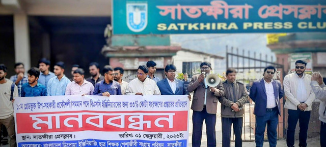 রবিবার (১ফেব্রুয়ারি) সকালে বাংলাদেশ ডিপ্লোমা ইঞ্জিনিয়ারিং ছাত্র-শিক্ষক পেশাজীবী সংগ্রাম পরিষদ সাতক্ষীরা জেলা শাখার আয়োজনে সাতক্ষীরা প্রেসক্লাবের সামনে সংগঠনের যুগ্ন আহবায়ক ও পাউবোর উপ বিভাগীয় প্রকৌশলী মো. রাশিদুল ইসলামের সভাপতিত্বে আলোচনা সভা ও মানববন্ধন কর্মসূচীতে প্রধান অতিথি হিসেবে বক্তব্য রাখেন আইডিইবি জেলা শাখার সাধারণ সম্পাদক ও শিক্ষা প্রকৌশল অধিদপ্তর সাতক্ষীরার সহকারি প্রকৌশলী এম. এম. এ আবু জায়েদ বিন গফুর।