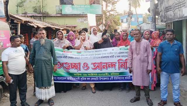 বাংলাদেশ জাতীয়তাবাদী শ্রমিক দল সাতক্ষীরা জেলা শাখা কর্তৃক দেবহাটা উপজেলা ও ৫টি ইউনিয়নের শ্রমিকদলের কমিটি দেওয়ায় কল সদস্যদের পক্ষ থেকে ২৬শে অক্টোবর রোজ রবিবার বিকাল ৪ টায় শুভেচ্ছাও আনন্দ মিছিল অনুষ্ঠিত হয়েছে। মিছিলটি উপজেলার পারুলিয়ার প্রধান প্রধান সড়ক প্রদক্ষিন করে পারুলিয়া ইছামতী হল মার্কেটের সামনে এসে।জেলা শ্রমীক দল নিয়ে একটি মহন বিতর্ক বক্তব্য প্রদান করায় একটি প্রতিবাদ সমাবেশ অনুষ্ঠিত হয়। এই সময় উপস্থিত থেকে বক্তব্য রাখেন সাতক্ষীরা জেলা শ্রমীক দলের উপদেষ্টা মোখলেছুর রহমান, আরো বক্তব্য রাখেন উপজেলা শ্রমীক দলের আহবায়ক মোক্তার আলী,সদস্য সচিব আনারুল ইসলাম, শ্রমীকদল নেতা সাইদ হোসেন, সরোয়ার হোসেন , উপজেলা শ্রমীক দলের যুগ্ম আহবায়ক সাজু পারভীন, সখিপুর ইউনিয়ন সভাপতি ফারুক হোসেন,সধারণ সম্পাদক রবিউল ইসলাম, সাংগঠনিক রেজাউল ইসলাম বাবু,পারুলিয়া ইউনিয়ন সভাপতি আমাজন হোসেন,সাধারণ সম্পাদক রাশিদুল ইসলাম,সাংগঠনিক সম্পাদক আশিকুর রহমান, কুলিয়া ইউনিয়ন সভাপতি আফ্রিদী, সধারণ সম্পাদক আবু সাইদ,সাংগঠনিক রাসেল, দেবহাটা ইউনিয়ন সভাপতি আব্দুর রাজ্জাক,সধারণ সম্পাদক আনারুল ইসলাম,সাংগঠনিক সম্পাদক কবির হোসেন,নওয়াপাড়া ইউনিয়ন সভাপতি দেব প্রশাদ, সধারণ সম্পাদক মিঠু, সাংগঠনিক সম্পাদক আনরুল ইসলাম। পারুলিয়া ইউনিয়ন যুগ্ম সম্পাদক মনিরুল ইসলাম সহ সকল ইউনিয়নের যুগ্ম আহবায়ক ও সদস্য বৃন্দু উপস্থিত ছিলেন।