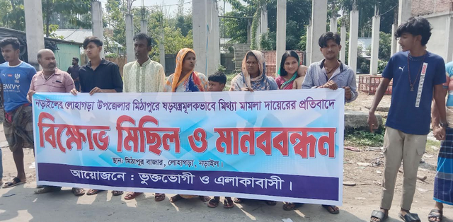 নড়াইলের লোহাগড়ায় মিঠাপুরে ষড়যন্ত্রমূলকভাবে মিথ্যা মামলা দায়েরের প্রতিবাদে বিক্ষোভ মিছিল মানববন্ধন কর্মসূচি পালিত হয়েছে। ভুক্তভোগী এলাকাবাসীর ব্যানারে  ১২ অক্টোবর মিঠাপুর  বাজারে এই প্রতিবাদ কর্মসূচি অনুষ্ঠিত হয়।