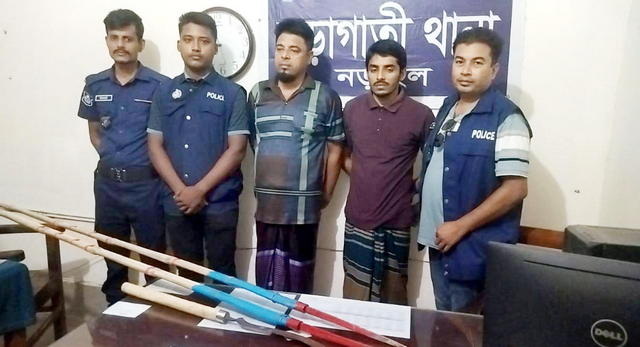 নড়াগাতী থানার ওসি আশিকুর রহমানসহ অভিযানে থাকা পুলিশ সদস্যরা তাদেরকে দ্রুত গ্রেফতার করতে সক্ষম হন। এছাড়া ঘটনাস্থল থেকে বাঁশের হাতলযুক্ত দুইটি লোহার সড়কি এবং কাঠের হাতলযুক্ত একটি ধারালো হাসুয়া উদ্ধার করেছে পুলিশ। অভিযোগ রয়েছে, এই সড়কি ও ধারালো অস্ত্র দিয়ে ভাই এবং ভাতিজাকে কুপিয়ে গুরুতর জখম করেছে লাবু ও তার ছেলে।