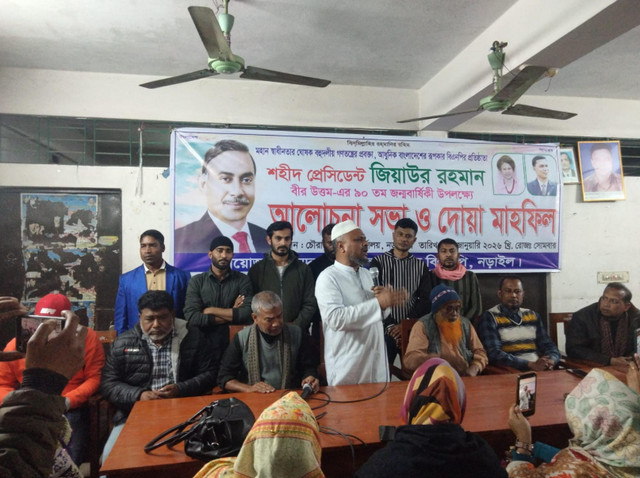 নড়াইলে নানা আয়োজনের মধ্য দিয়ে মহান স্বাধীনতার ঘোষক ও বাংলাদেশ জাতীয়তাবাদী দল (বিএনপি)-র প্রতিষ্ঠাতা, শহীদ রাষ্ট্রপতি জিয়াউর রহমানের ৯০তম জন্মবার্ষিকী পালিত হয়েছে। এ উপলক্ষে আজ সোমবার (১৯ জানুয়ারি) বিকেলে নড়াইল জেলা বিএনপির কার্যালয়ে আলোচনা সভা ও দোয়া মাহফিলের আয়োজন করা হয়। সদর উপজেলা বিএনপির সভাপতি বীর মুক্তিযোদ্ধা মোস্তাফিজুর রহমান আলেক এর সভাপতিত্বে প্রধান অতিথি ছিলেন জেলা বিএনপির সাধারণ সম্পাদক আলহাজ্ব মোহাম্মদ মনিরুল ইসলাম। এ সময় উপস্থিত ছিলেন সদর উপজেলা বিএনপির সাধারণ সম্পাদক মুজাহিদুর রহমান পলাশ, নগর বিএনপির সভাপতি তেলায়েত হোসেন বাবু, সাধারণ সম্পাদক খন্দকার ফসিয়ার রহমান রহমানসহ স্থানীয় বিএনপি ও এর অঙ্গ-সংগঠনের নেতৃবৃন্দ । আলোচনা সভায় বক্তারা শহীদ রাষ্ট্রপতি জিয়াউর রহমানের বর্ণাঢ্য কর্মময় জীবনের ওপর আলোকপাত করেন। তারা বলেন, আধুনিক বাংলাদেশের রূপকার হিসেবে জিয়াউর রহমানের অবদান অবিস্মরণীয়। বহুদলীয় গণতন্ত্র প্রবর্তন এবং দেশের উন্নয়নে তার নেওয়া পদক্ষেপগুলো আজও মানুষের হৃদয়ে অম্লান।