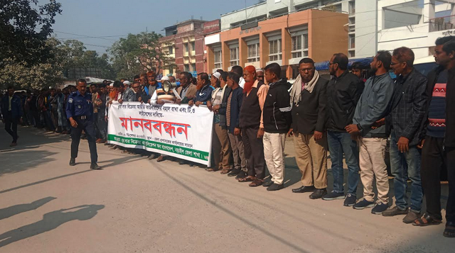 মানববন্ধনে বক্তব্য দেন ক্ষুদ্র সারব্যবসায়ী সমিতির আহবায়ক শফিকুল আলম ,সদস্য সচীব মনোয়ার হোসেন,পুলক কুমার বিশ^াস,জিয়ারুর রহমান, প্রমুখ।