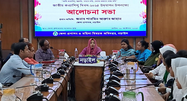 “আমি কন্যাশিশুর বন্ধু হবো, সাহসী হবো, দেশের কল্যাণে কাজ করবো” এই প্রতিপাদ্যকে সামনে রেখে নড়াইলে পালিত হয়েছে জাতীয় কন্যাশিশু দিবস। এ উপলক্ষে মঙ্গলবার (৮ অক্টোবর) সকালে জেলা প্রশাসন ও মহিলা বিষয়ক অধিদপ্তরের যৌথ উদ্যোগে জেলা প্রশাসকের সম্মেলন কক্ষে কবিতা আবৃতি ,সাংস্কৃতিক ও আলোচনা সভা অনুষ্ঠিত হয়। অনুষ্ঠানে অতিরিক্ত জেলা প্রশাসক, উপ সচিব লিংকন বিশ্বাসের সভাপতিত্বে প্রধান অতিথি হিসেবে উপস্থিত ছিলেন জেলা প্রশাসক শারমিন আক্তার জাহান।