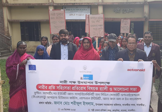 নারী পক্ষ উদযাপন উপলক্ষে নারীর প্রতি সহিংসতা প্রতিরোধ বিষয়ক র‍্যালি ও আলোচনা সভা অনুষ্ঠিত হয়েছে। বুধবার (০৩ ডিসেম্বর) সকাল সাড়ে ১১টায় সাতক্ষীরা সদরের ব্যাংদহা জোড়দিয়া পল্লী চেতনা প্রশিক্ষণ কেন্দ্রে সুশীল : সাপোর্টিং দ্যা ইউনিটি অ্যান্ড সাসটেইনেবিলিটি অব সিভিল সোসাইটি অর্গানাইজেশনস (সিএসওস) টু আপহোল্ড হিউম্যান রাইটস, ন্যাশনাল ইন্টিগ্রিটি, অ্যান্ড রুল অব ল ইন বাংলাদেশ প্রকল্পের আওতায় এবং ভূমিজ ফাউন্ডেশনের আয়োজনে একশন এইড বাংলাদেশের সহযোগিতায় ভূমিজ ফাউন্ডেশনের নির্বাহী প্রধান অচিন্ত্য সাহার সভাপতিত্বে আলোচনা সভায় প্রধান অতিথি হিসেবে বক্তব্য রাখেন সাতক্ষীরা সদর উপজেলা সমাজসেবা অফিসার মোঃ শরীফুল ইসলাম। প্রধান অতিথির বক্তব্যে তিনি বলেন, বর্তমান সমাজ ব্যবস্থায় দিন দিন অসহায় নারীর প্রতি সহিংসতা বৃদ্ধি পাচ্ছে। পুরুষতান্ত্রিক সমাজ ব্যবস্থায় নারীর প্রতি সহিংসতা রোধে কঠিন আইন প্রণয়ন করতে হবে। নারীর প্রতি সহিংসতা রোধে জনসচেতনতা তৈরি করতে হবে। নারীর প্রতি সহিংসতা রোধে নারীর পাশাপাশি পুরুষদেরকেও একসাথে বসতে হবে।