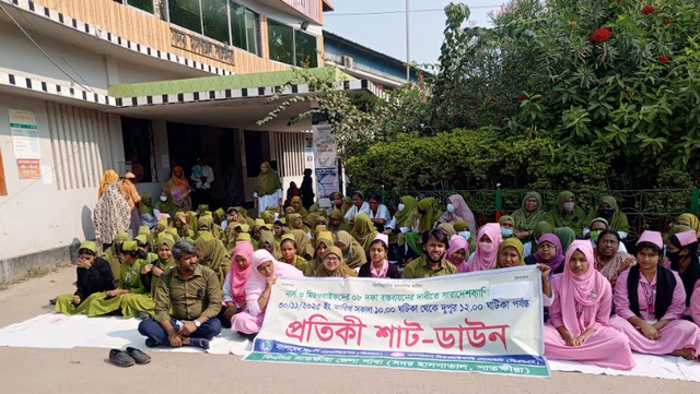 রবিবা (৩০ নভেম্বর) সকাল ১০ থেকে বেলা ১২ টা পর্যন্ত সদর হাসপাতালের সামনে ২ ঘন্টা প্রতিকী  শাট ডাউন পালন করেন। এতে চিকিৎসা সেবা ব্যাহত হয়। সাতক্ষীরা জেলা শাখার সভাপতি ডালিয়া পারভীনের সভাপতিত্বে কর্ম বিরতি বক্তব্য রাখেন অ্যাসোসিয়েশনের সাধারণ সম্পাদক নাসিমা খাতুন, কোষাধ্যক্ষ মাহমুদুল হাসান, স্বাস্থ্য পরিদর্শক ও মিডওয়াইফারি প্রতিনিধি নাসরিন খালেদ, ছাত্র-ছাত্রী প্রতিনিধি চঞ্চলা রানীসহ অন্যান্য নেতৃবৃন্দ।