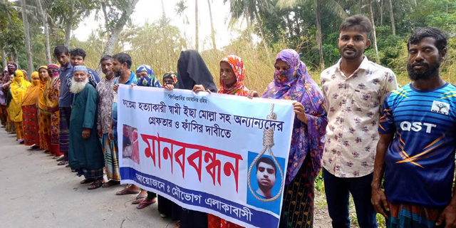 মানবন্ধনে অংশগ্রগনকারীরা বলেন, অবিলম্বে নিহত ফাতেমা বেগমের স্বামী ইছা মোল্লা ও ভাসুর মুছা মোল্লাকে অবিলম্বে গ্রেপ্তার করে তাদের ফাঁসির বিচার দাবী করেন।