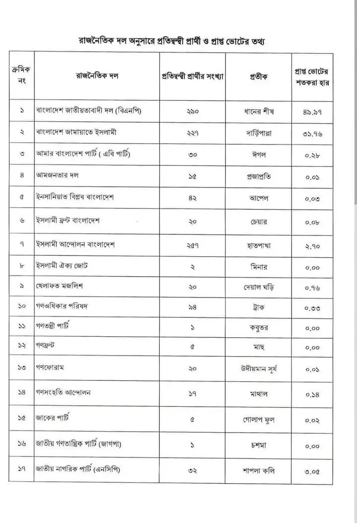 বিএনপি ভোট পেয়েছে ৪৯.৯৭%, জামায়াত ৩১.৭৬%, এনসিপি ৩.০৫%