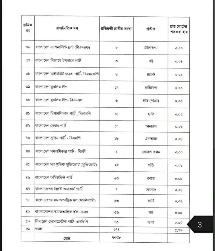 • জাতীয় নাগরিক পার্টি (এনসিপি): ৩ দশমিক ০৫ শতাংশ