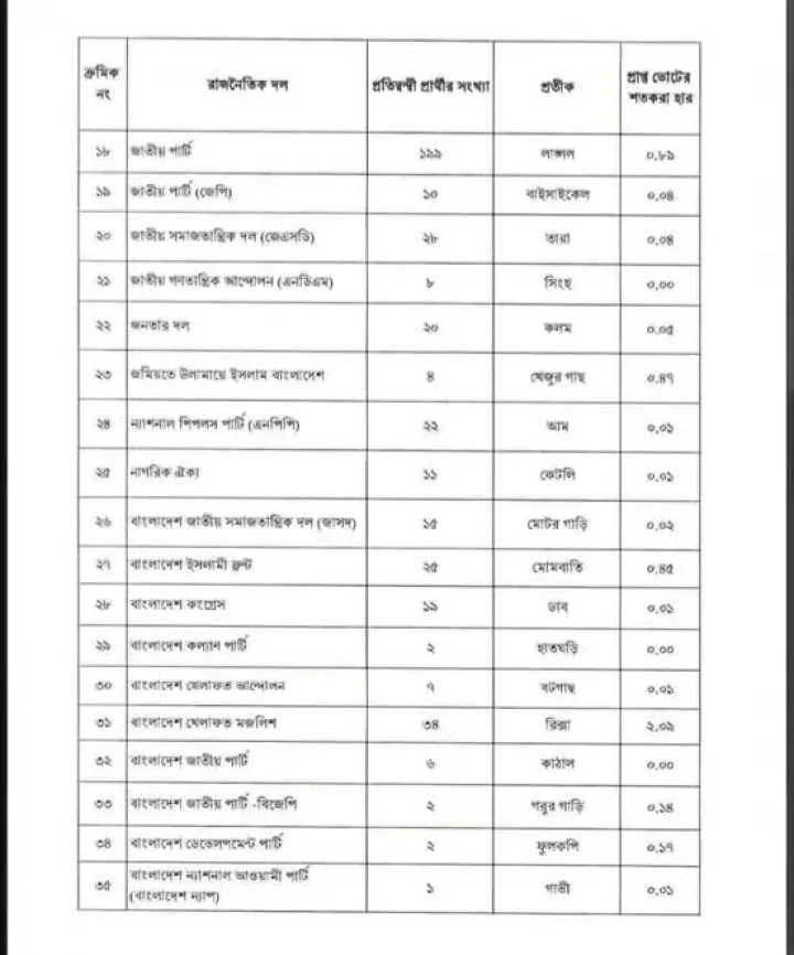 উল্লেখ্য, ১৯৯টি আসনে প্রার্থী দিলেও সাবেক সরকারি দল জাতীয় পার্টি পেয়েছে মাত্র শূন্য দশমিক ৮৯ শতাংশ ভোট।