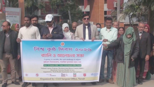 কুষ্ঠ রোগ নিরাময়যোগ্য, সামাজিক কুসংস্কার প্রকৃত বাধা এই প্রতিপাদ্যকে সামনে রখে নড়াইলে বিশ্ব কুষ্ঠ দিবস -২০২৬ পালিত হয়েছে। বেলা ১১ টায় এই উপলক্ষে সিভিল সার্জন কার্যালয় থেকে একটি র‌্যালি বের হয়ে শহরের প্রধান সড়ক প্রদক্ষিন করে একই স্থানে এসে শেষ হয়। পরে সিভিল সার্জন কার্যালয়ের হলরুমে এই উপলক্ষে আলোচনাসভা অনুষ্ঠিত হয়। সভায় সিভিল সার্জন ডাঃ মোঃ আব্দুর রশীদের সভাপতিত্বে আরো উপস্থিত ছিলেন নড়াইল সদর উপজেলা স্বাস্থ্য ও পরিবার কল্যান কর্মকর্তা ডাঃ রাজিব সরদার, সিভিল সার্জন কার্যালয়ের মেডিকেল অফিসার ডাঃ ইসমাইল হোসেন বাপ্পি, সিভিল সার্জন কার্যালয়ের জেলা স্বাস্থ্য তত্বাবধায়ক দুলাল চন্দ্র গাইন, (টিবি ও কুষ্ঠ রোগ) বিষয়ক জেলা ম্যানেজার শিউলী পারভিন, স্বাস্থ্য সহকারীবৃন্দ, এনজিও প্রতিনিধি, মিডিয়াকমীরা। আলোচনাসভায় বক্তারা, কুষ্ঠ রোগের বিভিন্ন দিক নিয়ে আলোচনা করেন। সভায় জানানো হয়, ২০১৩ সালের পর নড়াইল জেলায় কোন কুষ্ঠ রোগী শনাক্ত হয় নি।
