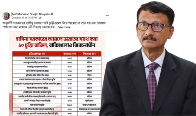 উল্লেখ্য, অন্তর্বর্তী সরকারের স্থানীয় সরকার উপদেষ্টা আসিফ মাহমুদ সজীব ভূঁইয়া সোমবার ফেসবুকে একটি ফটোকার্ড শেয়ার করেছিলেন, যেখানে দাবি করা হয়, ভারতের সঙ্গে ১০টি চুক্তি ও প্রকল্প বাতিল, বাকিগুলোও বিবেচনাধীন।