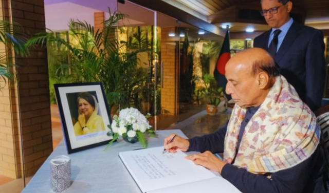 বৃহস্পতিবার (১ জানুয়ারি) দুপুরে ভারতের রাজধানী দিল্লিতে অবস্থিত বাংলাদেশ হাইকমিশনে গিয়ে তিনি বেগম জিয়ার স্মৃতির প্রতি শেষ শ্রদ্ধা নিবেদন করেন। এ সময় রাজনাথ সিং সেখানে রক্ষিত শোক বইতে ভারতের সরকার ও জনগণের পক্ষ থেকে আন্তরিক সমবেদনা জানিয়ে একটি বার্তা লেখেন। তিনি উল্লেখ করেন যে, বাংলাদেশের রাজনৈতিক ইতিহাসে খালেদা জিয়া কেবল একজন প্রভাবশালী নেত্রীই ছিলেন না, বরং দুই প্রতিবেশী দেশের বন্ধুত্বপূর্ণ সম্পর্ক এগিয়ে নিতে তার ভূমিকা ছিল অত্যন্ত তাৎপর্যপূর্ণ।
