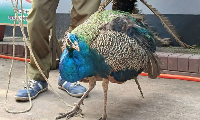 ময়ূর‌টির ওজন প্রায় চার কে‌জি ব‌লে জানায় স্থানীয়রারা। খবর পেয়ে রবিবার সকালে উপজেলা প্রশাসন ও বন বিভাগ ময়ূরটিকে উদ্ধার করে।