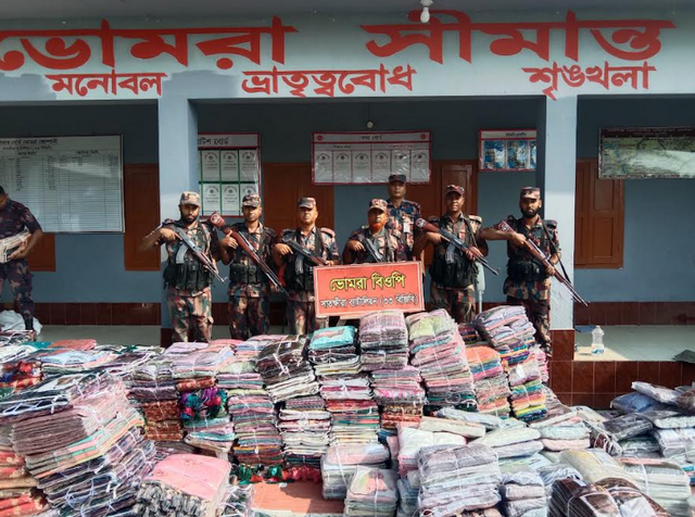 অপরদিকে, বিজিবি জানায়, তাদের হাতে জব্দকৃত পণ্যের মধ্যে রয়েছে ভারতীয় খৈল ২০ হাজার কেজি, অতি উন্নতমানের শাড়ী ২ হাজার ৪৮৯ পিস, উন্নতমানের শাড়ী ২ হাজার ১০০ পিস, অতি উন্নমানের থ্রি-পিস ৩৫৮ পিস, উন্নতমানের থ্রি-পিস ১৫০ পিস, ব্লাউজ ২০৫ পিস, ফেনসিডিল ১৫০ বোতল। এসময় ভারতীয় ট্রাক থেকে ওই মালামাল বাংলাদেশী দুটি ট্রাকে তোলার সময় তিনটি ট্রাকই জব্দ করা হয়।