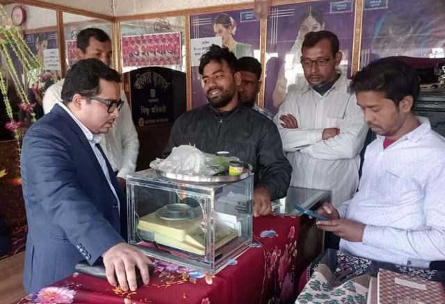 যশোরের মনিরামপুর উপজেলার চিনাটোলা বাজারে মেসার্স অধিকার জুয়েলারি দোকানে ব্যবহৃত স্বর্ণের ওজন পরিমাপক যন্ত্রের বিএসটিআইের বৈধ ভেরিফিকেশন সনদ না থাকার অভিযোগে ভ্রাম্যমান আদালত পরিচালনা করে দুই হাজার টাকা জরিমানা করা হয়েছে। বুধবার দুপুরের উপজেলার চিনাটোলা বাজারে এ ভ্রাম্যমান আদালত পরিচালনা করেন উপজেলা সহকারী কমিশনার (ভূমি) ও এক্সিকিউটিভ ম্যাজিস্ট্রেট মাহির দায়ান আমিন। এ সময় উপস্থিত ছিলেন বিএসটিআই যশোর জেলার আঞ্চলিক অফিসের পরিদর্শক রাকিব ইসলাম ও ভুমি অফিসের বেঞ্চ সহকারি আব্দুল গফ্ফার। জানা গেছে, বিএসটিআইের পরিদর্শকের কাছে অভিযোগ অধিকারী জুয়েলারি দোকানে ব্যবহৃত স্বর্ণের ওজন পরিমাপক যন্ত্রের জন্য বিএসটিআই কর্তৃক বৈধ ভেরিফিকেশন সনদ নেই। এমনকি ওজন ও পরিমাপ ভিত্তিতে মেসার্স অধিকারী জুয়েলার্সে অভিযান চালান। এ সময় ভ্রাম্যমান আদালত অভিযোগের সত্যতা পাওয়ার দোকানের স্বত্বাধিকারী বিষ্ণু অধিকারী কে ভ্রাম্যমান আদালতের বিচারক ওজন ও মানদন্ড আইনে দুই হাজার জরিমানা করাসহ সঠিক সনদপত্র তৈরি করতে সাত দিনের সময় বেঁধে দেওয়া হয়। এ সময় ভ্রাম্যমান আদালতের সহযোগিতা করেন মনিরামপুর থানার পুলিশ সদস্যরা। জনস্বার্থে এ অভিযান অব্যাহত থাকবে বলে জানিয়েছেন সংশ্লিষ্টরা।
