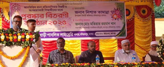 যশোরের মনিরামপুরে জ্ঞান ভিত্তিক রচনা প্রতিযোগীতায় বিজয়ী শিক্ষার্থীদের মাঝে পুরস্কার বিতরণ করা হয়েছে। শনিবার বিকেলে উপজেলার মুন্সিখানপুর এলাকায় খামারবাড়ি পাবলিক লাইব্রেরী উদ্যোগে এক আলোচনা সভা অনুষ্ঠিত হয়। লাইব্রেরির সভাপতি মতিয়ার রহমান খানের সভাপতিত্বে অনুষ্ঠানে সম্মানিত অতিথির বক্তব্য রাখেন, লাইব্রেরির আজীবন সদস্য ও উপজেলা বিএনপির সাধারণ সম্পাদক আসাদুজ্জামান মিন্টু, প্রতিষ্ঠাকালীন সদস্য ও উপজেলা বিএনপির সিনিয়র সহসভাপতি বীর মুক্তিযোদ্ধা খান আকতার হোসেন, সহসভাপতি এ্যাড. মকবুল ইসলাম, সাংগঠনিক সম্পাদক শফিয়ার রহমান খান, লাইব্রেরির সদস্য প্রভাষক দৌলত হোসেন খান, প্রেসক্লাবের সভাপতি এসএম মজনুর রহমান। শুভেচ্ছা বক্তব্য রাখেন খামারবাড়ি পাবলিক লাইব্রেরির সাধারন সম্পাদক জমিরুল ইসলাম। লাইব্রেরির সাহিত্য-সাংস্কৃতিক বিষয়ক সম্পাদক এসএম হাফিজুর রহমানের সঞ্চালনায় অন্যান্যদের মধ্যে উপস্থিত ছিলেন মনিরামপুর পাবলিক লাইব্রেরির সাধারন সম্পাদক মহিবুল্লাহ, মোস্তাফিজুর রহমান, মশিয়ার রহমান গাজী, সেলিম খান, প্রেসক্লাবের দপ্তর সম্পাদক আব্দুল্লাহ আল মামুন সোহান, তানভীর হাসান খান প্রমূখ। সম্প্রতি, জ্ঞান ভিত্তিক রচনা প্রতিযোগীতা উপজেলার বিভিন্ন শিক্ষা প্রতিষ্ঠান থেকে ৩২ জন শিক্ষার্থী অংশ নেয়। এদিন বিজয়ীদের শিক্ষার্থীদের হাতে সম্মাননা ক্রেস্ট, কৃৃতিত্বের সনদপত্র ও শিক্ষামূলক বই তুলে দেন অতিথিরা।