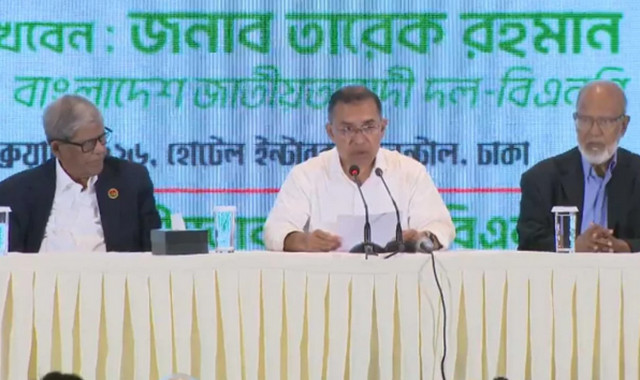 সংবাদ সম্মেলনে লিখিত বক্তব্য শেষে সাংবাদিকদের বিভিন্ন প্রশ্নের উত্তর দেন তারেক রহমান ও মঞ্চে থাকা বিএনপির কেন্দ্রীয় নেতারা।