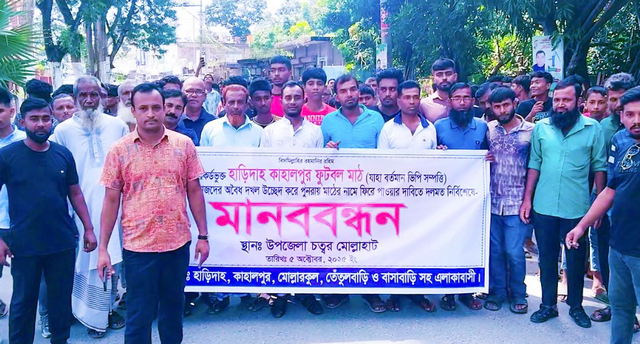 বাগেরহাটের মোল্লাহাটে হাড়িদাহ, কাহালপুরের ঐতিহ্যবাহী ফুটবল খেলার মাঠ ভূমিদস্যদের দখল মুক্ত করতে এলাকাবাসীর বিক্ষোভ ও মানববন্ধন অনুষ্ঠিত হয়েছে।