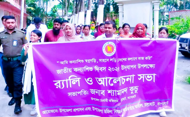 বুধবার (৮ অক্টোবর) সকাল ১১টায় বর্ণাঢ্য একটি র্যালি উপজেলা সদরের প্রধান প্রধান সড়ক প্রদক্ষিণ করে শুরুর স্থলে যেয়ে শেষ হয়। র্যালিতে বিভিন্ন স্কুলের শিক্ষার্থীরা প্ল্যাকার্ড ও ব্যানার নিয়ে অংশগ্রহণ করে, যাতে ‘কন্যাশিশুর অধিকার’ বিষয়ক নানান স্লোগান লেখা ছিল। র্যালি শেষে উপজেলা পরিষদ মিলনায়তনে একটি আলোচনা সভার আয়োজন করা হয়।