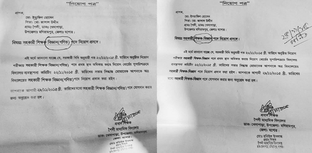 সূত্র মতে, প্রধান শিক্ষক রবিউল ইসলাম জাল-জালিয়াতির মাধ্যমে ষষ্ট-সপ্তম শ্রেণীর ‘খ’ শাখা বানিয়ে শিক্ষক নিয়োগ দিয়েছেন। জাল-জালিয়াতির মাধ্যমে নিয়োগ পাওয়া শিক্ষকদের মধ্যে রাজ আলী নামে একজনকেও নিয়োগ দেওয়া হয়েছিল। যিনি ২০২৫ সালের ৬ সেম্পেম্বর স্ট্রোক জনিত কারণে মৃত্যুবরণ করেন। সূত্র জানিয়েছে, ২০১৫ সালের ২১ অক্টোবর থেকে এনটিআরসি নিয়োগ হাতে নেওয়ায় বিদ্যালয় সংশ্লিষ্ট ব্যাক্তিরা ব্যাগডেটে এদেরকে নিয়োগ দেখিয়ে কাগজপত্র তৈরি করেছেন।
