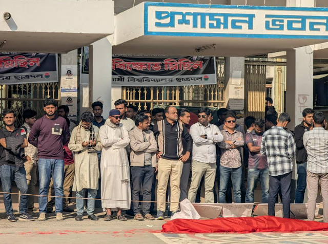 মঙ্গলবার (১৭ ডিসেম্বর) দুপুর ১টার দিকে বিশ্ববিদ্যালয়ের প্রশাসনিক ভবনের সামনে এ কর্মসূচি পালন করেন শিক্ষার্থীরা। এসময় শাখা ছাত্রদল, ছাত্রশিবির, বৈষম্যবিরোধী ছাত্র আন্দোলন এবং ইসলামী ছাত্র আন্দোলনসহ বিভিন্ন সংগঠনের নেতৃবৃন্দ এসময় উপস্থিত ছিলেন।