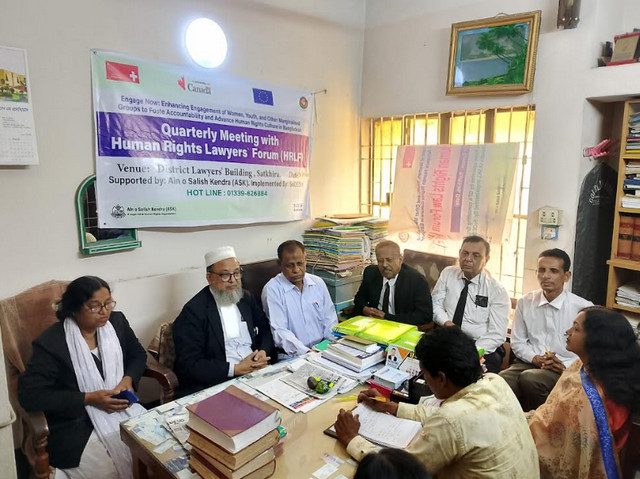 স্বদেশ সাতক্ষীরা এবং আইন ও সালিশ কেন্দ্র (আসক) এর সহযোগীতায় বাস্তবায়িত ‘‘জবাবদিহিতা ও মানবাধিকার সংস্কৃতিকে এগিয়ে নিতে বাংলাদেশের নারী যুবক এবং অন্যান্য প্রান্তিক জনগোষ্টির সক্ষমতা বৃদ্ধি করা’’ প্রকল্পটি দাতা সংস্থা এম্বাসি অব সুইজারল্যান্ড ও গ্লোবাল এফেয়ার্স  কানাডা –এর অর্থায়নে মানবাধিকার, নারীর অধিকার প্রতিষ্ঠা এবং নারী যুবক ও অন্যান্য প্রান্তিক জনগোষ্ঠিকে ক্ষমতায়িত করার লক্ষ্যে সুনিদিষ্ট কার্যক্রম বাস্তবায়িত হচ্ছে। এরই ধারাবাহিকতায় ১৫ মার্চ,২০২৬ তারিখে ২ টার সময় জেলা আইনজীবি ভবনের তৃতীয়র্ তলায়  মানবাধিকার আইনজীবি ফোরামের আহবায়ক সিনিয়র আইনজীবি এ্যাড: মোস্তফা আসাদুজ্জামান দিলু এর সভাপতিত্বে মানবাধিকার আইনজীবি ফোরাম সদস্যদের ত্রৈ- মাসিক সভা অনুষ্ঠিত হয়েছে।
