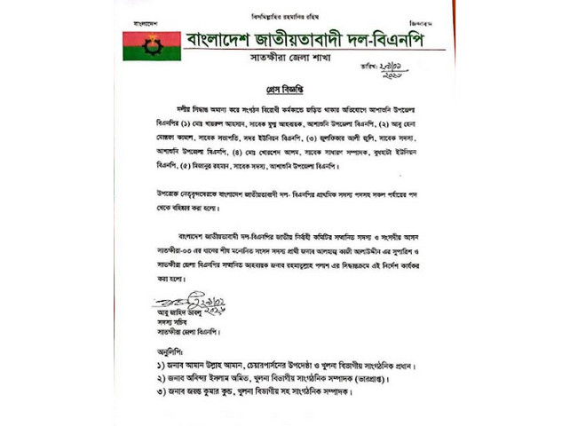 বহিষ্কৃতরা হলেন, কালিগঞ্জের নলতা ইউনিয়ন বিএনপির সদস্য ও নলতা ইউপি চেয়ারম্যান আজিজুর রহমান পাড়, কালিগঞ্জ উপজেলা বিএনপির সাবেক যুগ্ম আহবায়ক ও বিষ্ণুপুর ইউপি চেয়ারম্যান মোঃ জাহাঙ্গীর আলম, রতনপুর ইউনিয়ন বিএনপির সভাপতি মোঃ শিহাবউদ্দিন, সাংগঠনিক সম্পাদক আব্দুল কাদের, দক্ষিণ শ্রীপুর ইউনিয়ন বিএনপির সহ-সভাপতি সিরাজুল ইসলাম বাবলু, নলতা ইউনিয়ন বিএনপির সভাপতি কিসমাতুল বারী, সাংগঠনিক সম্পাদক ইয়াকুব আলী খান, কৃষ্ণনগর ইউনিয়ন বিএনপির সহ-সভাপতি আব্দুল আজিজ গাইন, নলতা ইউনিয়ন বিএনপির সাধারণ সম্পাদক মিলন কুমার সরকার, মৌতলা ইউনিয়ন বিএনপির সাধারণ সম্পাদক ফয়সাল কবীর, মথুরেশপুর ইউনিয়ন বিএনপির যুগ্ম সাধারণ সম্পাদক আমিনুর রহমান আঙ্গুর, ভাড়াশিমলা ইউনিয়ন বিএনপির সহ-সভাপতি জাকির হোসেন, তারালী ইউনিয়ন বিএনপির সহ-সভাপতি মোনাজাত সানা, বিষ্ণুপুর ইউনিয়ন বিএনপির সহ-সভাপতি মোঃ সফিরউদ্দীন সবুজ, কোষাধ্যক্ষ নুর ইসলাম মিলন, কুশুলিয়া ইউনিয়নের ১নং ওয়ার্ড বিএনপির সদস্য এস এম হাফিজুর রহমান বাবু, কুশুলিয়া ইউনিয়নের ২নং ওয়ার্ড বিএনপি সদস্য শেখ রবিউল ইসলাম এবং আশাশুনি উপজেলা বিএনপির সাবেক যুগ্ম আহবায়ক মোঃ খায়রুল আহসান, সাবেক সদস্য জুলফিকার আলী জুলি, সাবেক সদস্য মিজানুর রহমান, আশাশুনি সদর ইউনিয়ন বিএনপির সাবেক সভাপতি আবু হেনা মোস্তফা কামাল ও বুধহাটা ইউনিয়ন বিএনপির সাবেক সাধারণ সম্পাদক মোঃ খোরশেদ আলম।