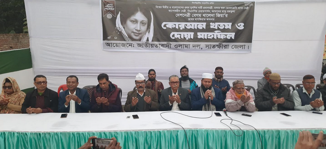 সাবেক প্রধানমন্ত্রী ও বিএনপি চেয়ারপার্সন বেগম খালেদা জিয়ার রুহের মাগফিরাত কামনায় কোরআন খতম ও দোয়া মাহফিল অনুষ্ঠিত হয়েছে। শনিবার (১০ জানুয়ারী) বিকালে শহরের নিউ মার্কেট চত্বরে সাতক্ষীরা জেলা ওলামা দলের আয়োজনে জেলা ওলামা দলের সভাপতি মাওলানা আনিসুর রহমান আজাদীর সভাপতিত্বে আলোচনা ও দোয়া অনুষ্ঠানে প্রধান অতিথি হিসেবে বক্তব্য রাখেন সাতক্ষীরা-২ (সাতক্ষীরা সদর-দেবহাটা) আসনে জাতীয়তাবাদী দল বিএনপি মনোনীত ধানের শীষের প্রার্থী আলহাজ্ব মো. আব্দুর রউফ।