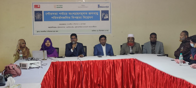 সাতক্ষীরা পৌরসভায় ২৯ ডিসেম্বর সোমবার সকালে পৌরসভা হল রুমে সাতক্ষীরা পৌরসভা ও রূপান্তরের আয়োজনে ওয়াটার এইড বাংলাদেশ ও সুইসকন্টাক্ট বাংলাদেশের সহযোগিতায় ওয়ার্ড দুর্যোগ ব্যাবস্থাপনা কমিটির সদস্য ও সিএসও সদস্যদের নিয়ে অংশগ্রহণমূলক জলবায়ু পরিবর্তনজনিত বিপন্নতা বিশ্লেষণ সভা অনুষ্ঠিত হয়। উক্ত সভায় প্রধান অতিথি হিসেবে উপস্থিত ছিলেন পৌরসভার প্রধান নির্বাহী কর্মকর্তা মো: আসাদুজ্জামান।