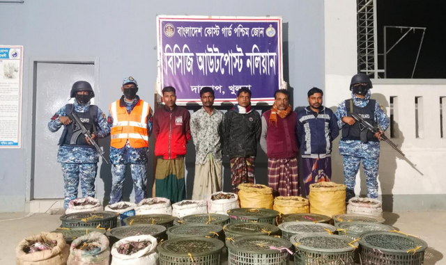 সুন্দরবনের কালাবগি থেজে ৪৯০ কেজি অবৈধ কাঁকড়াসহ ৫ কাঁকড়া ব্যবসায়ীকে আটক করেছে কোস্টগার্ড।  শনিবার সকালে বনের ভেতরে অভিযান চালিয়ে তাদের আটক করা হয়। কোস্ট গার্ড পশ্চিম জোনের মিডিয়া কর্মকর্তা লেফটেন্যান্ট কমান্ডার মোঃ মুনতাসীর ইবনে মহসিন বলেন,জব্দকৃত কাঁকড়া ও আটককৃত ব্যক্তিদের পরবর্তী আইনানুগ ব্যবস্থা গ্রহণের জন্য বন বিভাগের নিকট হস্তান্তর করা হয়। কোস্টগার্ড কর্মকর্তা আরও বলেন, দেশের বন ও সামুদ্রিক সম্পদ রক্ষায় কোস্ট গার্ড ভবিষ্যতেও এ ধরনের অভিযান অব্যাহত রাখবে।