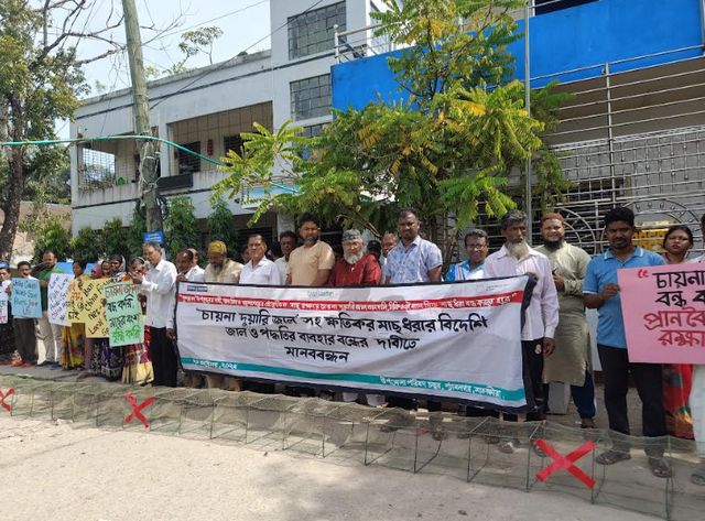 এগ্রোইকোলজি ফান্ড ও গবেষণা প্রতিষ্ঠান বারসিকের সহযোগিতায় মানববন্ধনে স্থানীয় জেলে স¤প্রদায়ের প্রতিনিধি, কৃষক, পরিবেশ কর্মী, নাগরিক সমাজের প্রতিনিধি ও যুবরা অংশ নেন। এসময় তারা ‘চায়না দুয়ারি জাল বন্ধ করো’, ‘জলজ সম্পদ বাঁচাও, জেলের জীবন রক্ষা করো’, ‘দেশীয় মাছের বিলুপ্তি রোধ করো’ প্রভৃতি শ্লোগান সংবলিত প্লাকার্ড প্রদর্শন করেন।