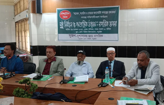 নড়াইলে-সচেতন, সংগঠিত সোচ্চার জনগোষ্ঠীই গণতন্ত্রের রক্ষাকবচএই প্রতিপাদ্যকে সামনে রেখে  সুষ্ঠ নির্বাচন গণতান্ত্রিক উত্তরণ নাগরিক ভাবনা শীর্ষক গোলটেবিল বৈঠক অনুষ্ঠিত হয়েছে। আজ ২৯ নভেম্বর শনিবার সকালে নড়াইল জেলা পরিষদ মিলনায়তনে গণতন্ত্র শক্তিশালীকরণ কার্যক্রমের অংশ হিসেবে সুশাসনের জন্য নাগরিক (সুজন) আয়োজিত সভার মূল আলোচনার বিষয় ছিল