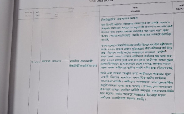 পরিদর্শন বইয়ের পাতায় দেখা যায়, একেবারে বাঁয়ে প্রথম সারিতে আজকের তারিখ লিখেছেন তিনি। এরপরের সারিতে নিজের নাম ‘তারেক রহমান’ ও পরিচয়ের সারিতে লিখেছেন, ‘মাননীয় প্রধানমন্ত্রী, গণপ্রজাতন্ত্রী বাংলাদেশ সরকার’। পরের সারিতে মন্তব্যের জায়গায় প্রায় ১৫০ শব্দে নিজের মন্তব্য লেখেন তিনি। সর্ব ডানে করেন স্বাক্ষর।